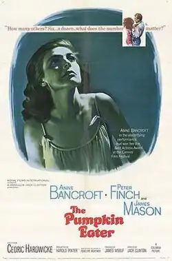 The Pumpkin Eater is a 1964 British drama film directed by Jack Clayton and starring Anne Bancroft and Peter Finch.[2] The film was adapted by Harold Pinter from the 1962 novel of the same title by Penelope Mortimer. The title is a reference to the nursery rhyme "Peter Peter Pumpkin Eater".