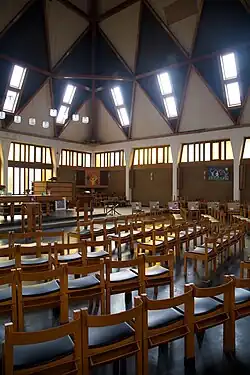 Following a promotion within the Church of Scotland to construct less hierarchical church buildings in the 1950s, an open-plan Modern design with Brutalist traits, by the architectural firm Honeyman, Jack & Robertson, was adapted for the new Anderson Parish Church.[1] The building consists of a 2-storey square-plan church with prominent pyramidal roof, with over 20 rooms. The foundation stone was laid in 1966, with a service of commemoration in the now demolished St Mark's-Lancefield Church. The building was completed in 1968.[2]