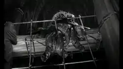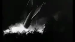Les Bowie provided the special effects: he had made his name perfecting an improved technique for matte painting, called the delineating matte, and formed a company with Vic Margutti that specialised in matte effects.[77] Bowie provided a number of matte paintings to enhance the scale of certain key shots in the film, including the crashed rocket, the Westminster Abbey set, and the shot of Quatermass walking away from the Abbey at the climax of the film.[78] Partly because of the concerns raised by the BBFC and partly on account of the low budget, Val Guest kept the creature largely off-screen for much of the film, feeling that audiences' imaginations would fill in the blanks more effectively than he and the special effects team could deliver on-screen.[79] For the climactic scenes at Westminster Abbey, Bowie created a monster from tripe and rubber and photographed it against a model of the Abbey.[68] There are also a couple of insert monster-closeup shots using an octopus, apparently fastened down out of water and with a few spikes appended to its sac, which is ultimately set afire. Sparks and fireworks were used for the shots of the creature being electrocuted.[80] Michael Carreras felt something was missing when he viewed the first cut of this scene: "There was this great glob of something hanging about on the scaffolding. And they had put in the best music they could and put the best effects on it, but it meant nothing as far as I was concerned … absolutely nothing at all".[81] "An eye was added to the model of the monster and a human scream added to the soundtrack" to give the creature some semblance of humanity in its final moments,[68] but this in fact is where the octopus was used. Models were also used for the rocket blasting off in the film's final shot.[82]