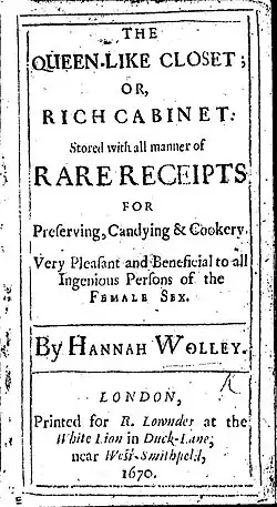 The Queen-like Closet, Or, Rich Cabinet was a cookery book published in 1670 by the English writer on household management, Hannah Woolley[a] (1622 – c.1675).[1] It ran through five English editions by 1684. At least two German editions were also printed.