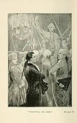 As the Vicomte de Saux refuses to join the Aristocrats, the mother and one brother of Mademoiselle de St. Alais denounce him utterly.[2] But Dénise herself, after having been saved by him from her burning chateau, loves him intensely and is true to him, though her relatives have betrothed her to the leader of the Royalists.[2] The other brother Louis, from his old friendship for the Vicomte, upholds his sister.[2] The book closes with a scene in the room where Madame de St. Alais lies dying from wounds received at the hands of the mob.[2] Her elder son has been killed by the revolutionists.[2] With the mother are Dénise and Louis, and also the Vicomte de Saux.[2] In her last moments she gives Dénise to her lover.[2] After their marriage the Vicomte and his bride retire to their country place at Saux.[2] The man to whom Dénise was betrothed out of vengeance to her lover, disappears after the overthrow of his party.[2]