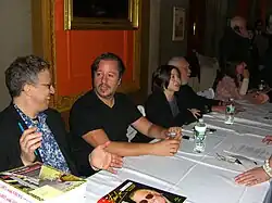 Haspiel at the 2012 Comic New York symposium at Columbia University. Sitting with Haspiel are (left to right) Danny Fingeroth, Miss Lasko-Gross, Al Jaffee and Tracy White.