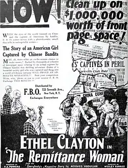 The Remittance Woman is a 1923 American silent drama film directed by Wesley Ruggles and starring Ethel Clayton, Rockliffe Fellowes, and Mario Carillo.[1][2] A remittance man (or woman) was one sent away from home (usually Britain) to avoid shame on the family. The following year a book of the same title appeared, by American pulp author Achmed Abdullah.