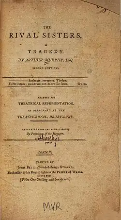 The Rival Sisters is a 1793 tragedy by the Irish writer Arthur Murphy.[1] His final play, it premiered at the Theatre Royal, Haymarket in London on 18 March 1793.[2] It had been first written in 1783 and then published in 1786.[3] It was staged by the company of the Drury Lane company under Richard Brinsley Sheridan who were at the Haymarket while their own theatre was rebuilt. The London cast included Sarah Siddons as Ariadne, Jane Powell as Phaedra, John Philip Kemble as Perithous, Richard Wroughton as Periander, King of Naxos, Robert Palmer as Theseus, John Hayman Packer as Archon and Thomas Caulfield as Aletes. It ran for around nine performances.[4]