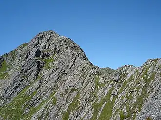 From here the route continues westwards up and over Sgùrr nan Forcan and so up to the main summit. This section is often regarded one of the best ridge walks in Scotland. There is no technical rock-climbing on the ridge, but a good head for heights, appropriate footwear, and some scrambling ability are required. (In winter a rope may be needed to safeguard the descent from the ridge.)