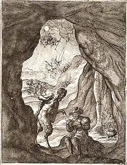For a variety of reasons the fable of "The Satyr and the Peasant" in particular became one of the most popular genre subjects in Europe and by some artists was painted in many versions. It was particularly popular in the Netherlands, where it brought together the contemporary taste for Classical mythology and a local liking for peasant subjects. At the start of the 17th century the poet Joost van den Vondel published his popular collection based on Marcus Gheeraerts' prints, Vorstelijke Warande der Dieren (Princely pleasure-ground of beasts, 1617), in which the poem Satyr en Boer appears.[20] This seems to have appealed to the imagination of the young Jacob Jordaens, who went on to produce some dozen versions of the subject and did more than any other painter to popularise it.[21] He was followed in his native Antwerp by others such as Willem van Herp, David Ryckaert the younger and Jan Cossiers, while in the Dutch Republic it was taken up by the group of Rembrandt's pupils and followers, Gerbrand van den Eeckhout, Barent Fabritius and Claes Corneliszoon Moeyaert, as well as by genre painters like Benjamin Gerritsz Cuyp and Jan Steen.
