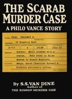 The Scarab Murder Case (1930) is a classic whodunit written by S. S. Van Dine. In this book, detective Philo Vance's murder investigation takes place in a private home that doubles as a museum of Egyptology, and the solution depends in part on Vance's extensive knowledge of Egyptian history and customs, which enable him to sort through suggestions of godly vengeance and reveal the misdirections perpetrated by the real murderer.