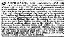 Adam died in 1862 and his wife Emily continued to live at the house until her death in 1875. The estate was then sold to the local landholder William Garnett (1851-1929)[6] who owned Quernmore Park. He did not live at the house. Instead he rented it successively to wealthy tenants. The first rental advertisement which was in 1877 is shown.