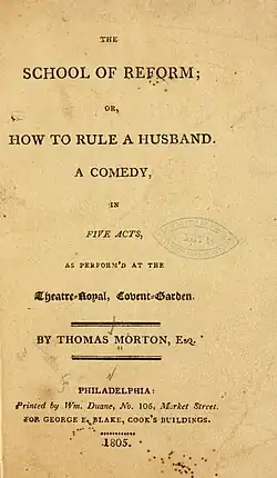 The School of Reform is an 1805 comedy play by the British writer Thomas Morton. It premiered at the Theatre Royal, Covent Garden on 15 January 1805.[1] The original cast included George Frederick Cooke as Lord Avondale, Joseph Shepherd Munden as General Tarragan, John Emery as Tyke, Charles Murray as Old Man, Charles Klanert as Peter, Maria Gibbs as Mrs St. Clair, Harriett Litchfield as Mrs Ferment and Mary Ann Davenport as Mrs Nicely. It was later staged at the Crow Street Theatre in Dublin.[2]