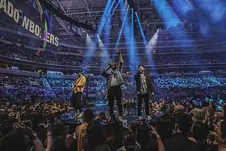On December 3, 2013, Hoffman tweeted to Justin Timberlake from the band's Twitter account, telling him he needed to check out their cover of his song "Pusher Love Girl". It caught his attention and Timberlake posted a tweet about the video.[8] The trio met with Timberlake a couple of weeks later during his 20/20 Tour[9] and he offered to mentor them and help them shape their sound.[10] Later, he signed them to his artist development label, Villa 40,[2][11] and in June 2017, the band joined Justin Timberlake and K-Kov at a studio in New York to record new music.[12]