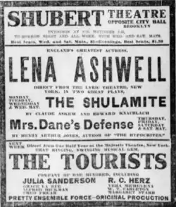 Ashwell took The Shulamite across the Atlantic, introducing it in Chicago.[6] The Shubert Brothers produced the play in the United States. Advance notices said "The Shulamite, according to the London reviewers, ranks even ahead of Pinero's His House in Order as the most powerful play of the London season."[7] Later reviews were tepid. A New York critic warned theatergoers on 21 October 1906, "Miss Ashwell has been a competent and prominent actress in London for several years now, but in reading of her work I have never seen the emphasis placed so heavily on her poetic and imaginative qualities as the Chicago brethren place it. The quality is fortunate and timely, because from all accounts The Shulamite, which we shall see next week, sadly needs poetry for its appreciation."[6]