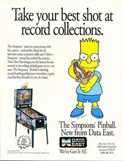 The pinball game was released by Data East Pinball in 1990.[4][5] It was licensed by Fox and produced in Data East's factory in Melrose Park, Illinois.[1] According to an article in Chicago Sun-Times, the producers took advice from The Simpsons creator Matt Groening while developing the game.[1] On November 9, 1990, Data East executive vice-president Gary Stern described the game to the press as "fun – a whole package ... voices, music, artwork, great ramps."[4] He also noted that "This game is already on its way to becoming a monster hit."[1] In 2007, Stern said in an interview with License! that "While we export about one-third of our games, that first [The Simpsons pinball] model did especially well in the U.S."[6]
