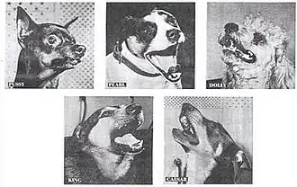 Carl Weismann, while recording the sounds of birds for other projects, ended up with many recordings that were spoiled by dogs barking. Weismann found a new use for these spoiled takes by splicing together the pitches of dog barks into the pattern of songs.[1] He teamed up with Don Charles, a record producer working in Copenhagen, Denmark (not to be confused with English singer and record producer Don Charles).[2] Weismann used recordings of five dogs barking (their names were Dolly, Pearl, Pussy, Caesar, and King), spliced them on reel-to-reel tape, and arranged the pitches to the tune of the Stephen Foster song "Oh! Susanna". Charles provided the musical accompaniment. This was released by RCA Victor in 1955 as the A-side on a 7" single, with the B-side a medley of "Pat-a-Cake", "Three Blind Mice", and "Jingle Bells". The novelty record became a hit, reaching #22 on the US Billboard Pop Singles chart.[2] The disc eventually sold over a million copies.[3][4] In 1956, the troupe of dogs (with a fifth member, Pussy) were again recorded, yielding the single "Hot Dog Rock 'n Roll" b/w "Hot Dog Boogie". This recording is listed as being "directed" by Carl Weismann.