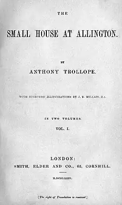The Small House at Allington is a novel by English novelist Anthony Trollope. It first appeared as a serial in the 1862 July to December edition of the Cornhill Magazine, and ended its run in the July to December edition of the following year. It was later published 1864 as a two volume novel. It is the fifth book in the Chronicles of Barsetshire series, preceded by Framley Parsonage and followed by The Last Chronicle of Barset. It enjoyed a revival in popularity in the early 1990s when the British prime minister, John Major, declared it as his favourite book.