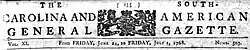 - ^ About The South-Carolina & American general gazette. [volume] (Charlestown [S.C.]) 1764-1781, Chronicling America, Retrieved 12 June 2018