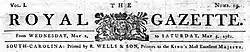 The paper was founded as The South-Carolina Weekly Gazette in 1758 by Robert Wells and G. Bruce, and changed names to The South-Carolina and American General Gazette in 1764. Aside from some periods of suspension during the American Revolutionary War, it published until February 1781. When Charleston and the paper fell under British control, it published under the title The Royal Gazette from March 1781 and into 1782.[1][2][3] Wells was a loyalist and left for England in 1775 once war seemed inevitable, and the paper was continued by his son John Wells.[4][5]