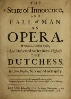 The State of Innocence is a dramatic work by John Dryden, originally intended as the libretto to an opera. It was written around 1673–4,[1] and first published in 1677. The work is a rhymed adaption of John Milton's epic poem Paradise Lost, and retells the Biblical story of the fall of man.