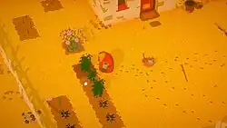 Stillness follows a Harvest Moon-esque gameplay style, where the player controls Talma, an elderly farmer who takes care of goats, chickens, and plants.[1] Unlike other farming simulation games, Talma moves slowly and struggles with basic tasks, but emotes joy when taking care of her animals and laughs when playing on the ground.[2] Talma is able to forage in the desert for fungi, and interact with a passing salesman. Letters are sent from family members speaking of an unknown, but dark situation in the city and the tone of their language has increasing desperation as the game continues.[1]