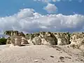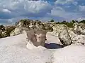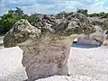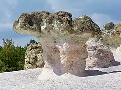 The Stone Mushrooms (Bulgarian: Каменните гъби) are a rock phenomenon near Beli plast village in Bulgaria, on the road between Haskovo and Kardzhali. They are about 2.5 metres tall. The 3-hectare (7.4-acre) area was declared to be a natural resource on 13 May 1974, according to №РД-552 bill of the Ministry of Environment and Water. Interesting kinds of birds can be observed in the area: short-toed eagle, Egyptian vulture, red-rumped swallow, eastern black-eared wheatear, etc.