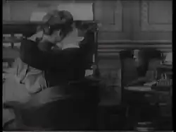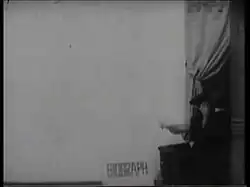 Original features of this short film have been highlighted by various commentators, notably the use of a mise en abyme with the film-in-film process involving the filming of a scene by a camera visible on-screen and the later display of the film taken. Tom Gunning mentions it as one of the earliest example of the camera playing an "essential role as the mute yet unassailable witness of a crime."[4] Christian Quendler cites it as the first example of the way in which the dissonances between human perception and camera vision have been the object of playful exploration in early films. He argues that the film "consciously exploits the reconciliation of these dissonances as a means of self-promotion".[5] This is reinforced by the fact that the Biograph brand is displayed on a sign shown in front of the screen before the film starts. Judith Mayne mentions the film as the first example of a new category of films where the storyteller is the photographer or image-maker, also stressing that the action takes place in the office of the Biograph company.[6]