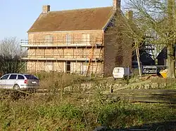 Lawshall Hall is a mid-16th-century red brick house with some blue brick diapering, built on a T-shaped plan, with the older wing extending north-west. The house may have been part of an old monastery and has massive brick walls approximately 6 feet thick in places. Part of the original wall is apparent at the north-west end of the front wing, with 2 small stone framed windows and a Tudor arched doorway. The house has been greatly altered and was refronted on the south-west elevation in the 19th century with 3 window range of double-hung sashes. The north-east wing has some original mullioned and transomed windows but has been partly blocked. The roof was tiled in the 20th century. The house is dated 1557 with the arms of the Drury's.[4] Queen Elizabeth I visited Henry Drury at Lawshall Hall during her "Royal Progress" tour in August 1578.[2]