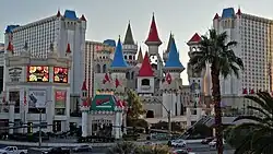 Titled "Sim City (1995–2001)", the sixth chapter outlines how the Strip's architecture progressed from imitating Disney fairy tales to "simulating authentic architectural heritage".[8] As cities like New York for Times Square attempted to cleanse dirty areas, Las Vegas presented imitations that were sanitized and regulated representations of reality.[11] The postmodern architecture theme increasingly prioritized recreating cultural heritage.[12] In Las Vegas, companies built New York City, Paris, Venice, and other replicas.[12][13] The Venetian, the Venice replica, had a Rialto Bridge, a campanile, and canals. The New York-New York casino, the New York replica, featured Statue of Liberty and Empire State Building replicas. The Aladdin hotel had a Middle Eastern theme with imitations of Cairo and Marrakesh structures.[8] Mandalay Bay had an artificial beach.[16] The replicas triggered theorists to call the Strip "fake".[12][13] Al examines the tension in the ongoing argument over authenticity that continues to envelop Las Vegas.[12]