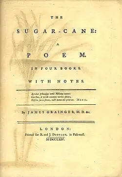 Although Grainger's The Sugar Cane remains the best known 18th century poem on a West Indian subject, others were written both before and after it. Nathaniel Weekes' Barbados, a poem (1754) was a forerunner that also included a consideration of sugar cane.[2] Not long after the appearance of Grainger's work, John Singleton published A general description of the West Indian islands (1767) in which he paid tribute to the poem as a successful model.[3] Later there was also a sideways allusion to Grainger in the anonymous Jamaica, a poem in three parts (1777), where the "Argument" to part one declares that "The Muse thinks it disgraceful in a Briton to sing of the Sugar-cane, since it is owing the Slavery of the Negroes".[4]