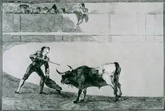 Each time he let the bull pass so close that the man and the bull and the cape that filled and pivoted ahead of the bull were all one sharply etched mass. It was all so slow and so controlled. It was as though he were rocking the bull to sleep. He made four veronicas like that ... and came away toward the applause, his hand on his hip, his cape on his arm, and the bull watching his back going away. —bullfighting scene from The Sun Also Rises[81]