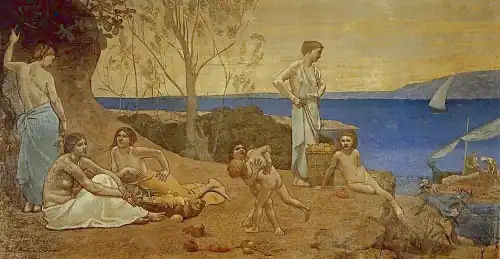 It is a fundamental pictorial work when studying symbolism since it is a capital work in the production of Pierre Puvis de Chavannes. It depicts a series of characters recreating themselves on the shores of a lake. The fact that there is hardly any sensation of depth stands out. The palette that the painter uses here gives the work greater mysticism, something sought after among the French symbolists.