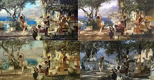 Siemiradzki made four versions, each with a slightly different composition and colour scheme. One of the versions, originally commissioned by K. T. Soldatenkov, is located at the Tretyakov Gallery in Moscow. Another version was sold at auction in 2011 for 2,098,500 dollars, which was the new record for a Siemiradzki painting.[1][2] The record was held until 2013, when Un naufragé mendiant was sold for 1,082,500 Pound sterling.[2][3] All are painted with oil paint on canvas.