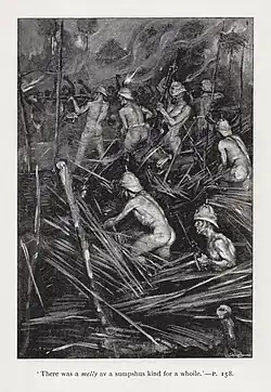 Mulvaney persuades the Lieutenant not to await reinforcements, but to "visit" Lungtungpen that night. Mulvaney is in the lead when they come to the river, and tells the four men with him to strip and swim across. Two of them can't swim, but they use a tree trunk for flotation and cross the river – despite their discovery that "That shtrame [= stream] was miles woide!" When they reach the other side, in the dark they have landed on the river wall of Lungtungpen, and a fierce fight ensues – but the British are so close under the wall that, in the dark, the Burmese fire passes harmlessly over their heads.