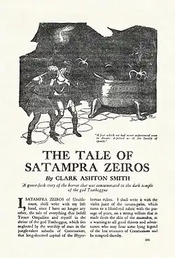 "The Tale of Satampra Zeiros" is a short story written in 1929 by American author Clark Ashton Smith as part of his Hyperborean cycle, and first published in the November 1931 issue of Weird Tales. It is the story in which Smith created the Cthulhu Mythos entity Tsathoggua.