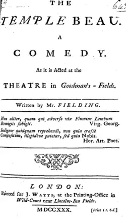 Fielding wrote The Temple Beau sometime after leaving Leiden in April 1729. It was the fourth play that Fielding wrote and he finished it by the end of 1729.[1] Although his first play was performed at the Theatre Royal, The Temple Beau was rejected by the theatre.[2] He turned to Goodman's Fields and the play was first advertised, in the 16 January 1730 Daily Journal, as being rehearsed and to open 22 January. A deferral notice was posted on 22 January 1730 in the Daily Journal and Daily Courant stating that the play would open 26 January.[3][4]