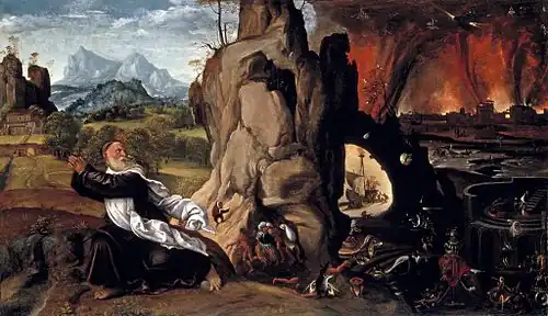 Originally produced for a private studiolo, it is a homage to the work of Hieronymus Bosch, which Savoldo would have seen in cardinal Domenico Grimani's collection in Venice. From Bosch's The Hermit Saints he draws the motif of the saint fleeing to the left away from demons in a rocky infernal landscape on the right.[2]