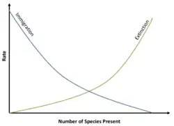 In Chapters 2 and 3, MacArthur and Wilson postulate that insular species richness depends on island size and isolation from source regions. The authors present an equilibrium model that is based on the following concept: when there is an addition of the number of species on an island, the island's immigration rate of new species will decrease while the extinction rate of resident species will increase. MacArthur and Wilson thus assume that there will be an equilibrial point where the immigration rate equals the extinction rate. They further hypothesize that an increase in island size will lower extinction curves while a decrease in distance between the island and the source region will raise immigration curves. Since the intersection of immigration and extinction rate curves determines the species number, the authors predict that larger islands will have more species than smaller islands (assuming these islands are comparably isolated) and isolated islands will have fewer species than islands more proximal to source regions (assuming these islands are equally large). There is additional discourse on how insular clusters and stepping stones affect this model.