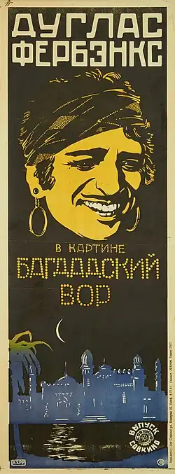 Fairbanks considered this to be the favorite of his films, according to his son.[4] The imaginative gymnastics suited the athletic star, whose "catlike, seemingly effortless" movements were as much dance as gymnastics.[5] Along with his earlier The Mark of Zorro (1920) and Robin Hood (1922), the film marked Fairbanks's transformation from genial comedy to a career in "swashbuckling" roles.[6] The film, strong on special effects (flying carpet, magic rope and fearsome monsters) and featuring massive Arabian-style sets, also proved to be a stepping stone for Anna May Wong, who portrayed a treacherous Mongol slave.
