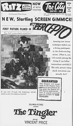 "Percepto!" was a gimmick where Castle attached electrical "buzzers" to the underside of some seats in theaters where The Tingler was screened to provide "tingling" sensations during certain scenes.[14][8] The buzzers were small surplus airplane wing deicing motors left from World War II. The cost of this equipment added $250,000 to the film's budget.[1] It was used predominantly in larger theaters. The prologue claimed some people might not be susceptible to the "tingling" to take account that not all seats were wired.[8]