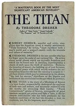 The Titan is a novel by Theodore Dreiser, completed in 1914 as a sequel to his 1912 novel The Financier.[1] Both books were originally a single manuscript, but the narrative's length required splitting it into two separate novels.[2] Dreiser's manuscript of The Titan was rejected by Harper & Brothers, publisher of The Financier, due to its uncompromising realism; John Lane published the book in 1914.[3] The Titan is the second part of Dreiser's Trilogy of Desire, a saga of ruthless businessman Frank Cowperwood (modeled after real-life streetcar tycoon Charles Yerkes). The third part of the trilogy, The Stoic, was Dreiser's final novel, published in 1947 after his death.