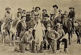 There are so many dare-devils in pictures, that it seems a difficult matter to award the palm of courage to any particular company of screen players. But certainly Jack Ford's would give the others a run for their money. This is the way they looked when they began work on Jack's picture, The Trail of Hate, but no one could induce them to pose after the picture was completed. When Jack has finished a picture his players are not fit for publication....[8]