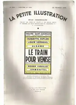The Train for Venice (French: Le train pour Venise) is a 1937 comedy play by Georges Berr and Louis Verneuil. A farce, it premiered at the Théâtre Saint-Georges in Paris with a cast that included Verneuil, Huguette Duflos, André Alerme and Roland Armontel.