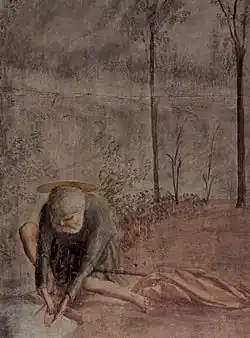 The Brancacci Chapel, in the basilica of Santa Maria del Carmine, was founded around 1366/7 by Pietro Brancacci.[3] The chapel passed to Pietro's nephew, Felice Brancacci, who some time between 1423 and 1425 commissioned the painter Masolino to decorate the walls with a series of frescoes from the life of Saint Peter. Peter was the name-saint of the founder, and the patron saint of the Brancacci family, but the choice also reflected support for the Roman papacy during the Great Schism.[4]