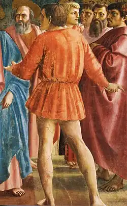 Christ and the disciples are placed in a semicircle, reflecting the shape of the chapel's apse. The tax collector, on the other hand, stands outside the holy space.[12] While the group of holy men are dressed almost entirely in robes of pastel pink and blue, the official wears a shorter tunic of a striking vermilion. The colour adds to the impertinence expressed through his gestures.[13] Another way contrast is achieved is in the way – both in the central scene and on the right – the tax collector's postures are copying almost exactly those of Peter, only seen from the opposite angle. This gives a three-dimensional quality to the figures, allowing the spectator to view them from all sides.[9]
