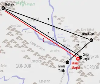 | Minas Morgul | Chosen | The nine Nazgûl | The tower, as Minas Ithil, Tower of the Rising Moon, was once part of Gondor; it guarded Gondor from the threat of Mordor, but has now been occupied by the nine Ringwraiths, powerful servants of the Dark Lord, and renamed to Minas Morgul, the Tower of Sorcery.[7] Their leader is the Witch-King of Angmar, like the others enslaved by a Ring of Power given by Sauron. |