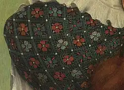 The painting technique reflects Matsys himself and is similar to his other work. The paint is worked in many places wet-in-wet and has been dragged and feathered. Matsys popularly used feathering to soften and blend transitions of tone.[8] The hair near the Duchess's right ear and the embroidery on her right cuff are rendered in sgraffito, a technique done by scratching through a layer of wet paint to show the underlying layers.[9] Matsys achieved the uneven appearance of her flesh by layering the basic pink with red and white dots in sporadic dashes and blotches. Matsys displays finer attention to detail through his brushwork when looking at the ornamental brooch. In the brooch are at least five shades of brown, orange, pink and yellow to achieve its golden hue.[7]
