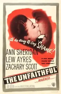 The Unfaithful is a 1947 American murder mystery film noir directed by Vincent Sherman and starring Ann Sheridan, Lew Ayres and Zachary Scott. It was produced and distributed by Warner Brothers. Regarded by some as a film noir, the picture is based on the W. Somerset Maugham-penned 1927 play and William Wyler-directed 1940 film The Letter,[4] which was reworked and turned into an original screenplay by writers David Goodis and James Gunn who shifted the setting from Malaya to the United States.
