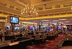The Venetian includes a 120,000 sq ft (11,000 m2) casino.[124] Due to lack of demand, the resort's poker room closed in 2000, with plans to expand the race and sports book.[125] Amid a resurgence in poker popularity, the resort added a new $2.6 million poker room in 2006, featuring 39 tables. At 11,000 sq ft (1,000 m2), it was the third largest poker room on the Strip.[126][127] The resort eventually replaced it with the larger Sands Poker Room, which debuted in 2012. It was the largest on the Strip, measuring 14,000 sq ft (1,300 m2).[128] A new space of equal size, named The Poker Room, opened in 2024.[129]