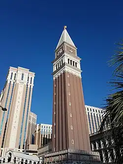 The exterior entrance along the Las Vegas Strip is modeled on the Doge's Palace and includes a recreation of the Rialto Bridge.[109][119] It also features a 315-foot-high (96 m) replica of St Mark's Campanile, topped by a statue depicting Gabriel.[13][113][109] A revolving restaurant or lounge had been considered for the top of the tower, but it was deemed too small, measuring only 40 square feet.[120] The Grand Canal Shoppes occupy an indoor plaza with a recreation of St. Mark's Square and features a sky-painted ceiling.[108][115] Another area of the resort features 21 faux Renaissance-era paintings that were framed and attached to the ceiling.[3]