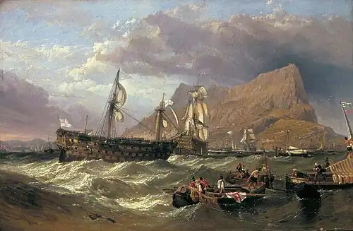 The Victory Towed into Gibraltar is an 1853 oil painting by the British artist Clarkson Stanfield. [1] Combining seascape and history painting, it depicts the Royal Navy's HMS Victory being towed into the British stronghold of Gibraltar in 1805 with the Rock of Gibraltar visible in the background. The painting is set a week after the Battle of Trafalgar, a decisive British victory over a combined Franco-Spanish fleet during the Napoleonic Wars. In the aftermath of the battle, a violent storm had a heavy impact on the already battered British fleet. On the right are fishing boats whose occupants watch the passing ship.[2]