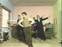 A screenshot of the rare music video of the song which shows the band members appearing to stand at an unnatural angle as the camera is tilted to meet the same angle as the slanted room.