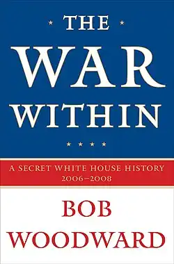 The War Within: A Secret White House History (2006–2008) is a non-fiction book by Washington Post reporter Bob Woodward that was released by publisher Simon & Schuster on September 8, 2008.[1] It is the fifteenth book written by Woodward, the fourth in a series of books about President George W. Bush and his administration's foreign policy including Bush at War, Plan of Attack, and State of Denial.[1] The book discusses the debate within the administration about the controversial Iraq "surge" strategy implemented in 2007.[1] Simon & Schuster editor Alice Mayhew said in an official statement that "There has not been such an authoritative and intimate account of presidential decision making since the Nixon tapes and the Pentagon Papers. This is the declassification of what went on in secret, behind the scenes."[1]